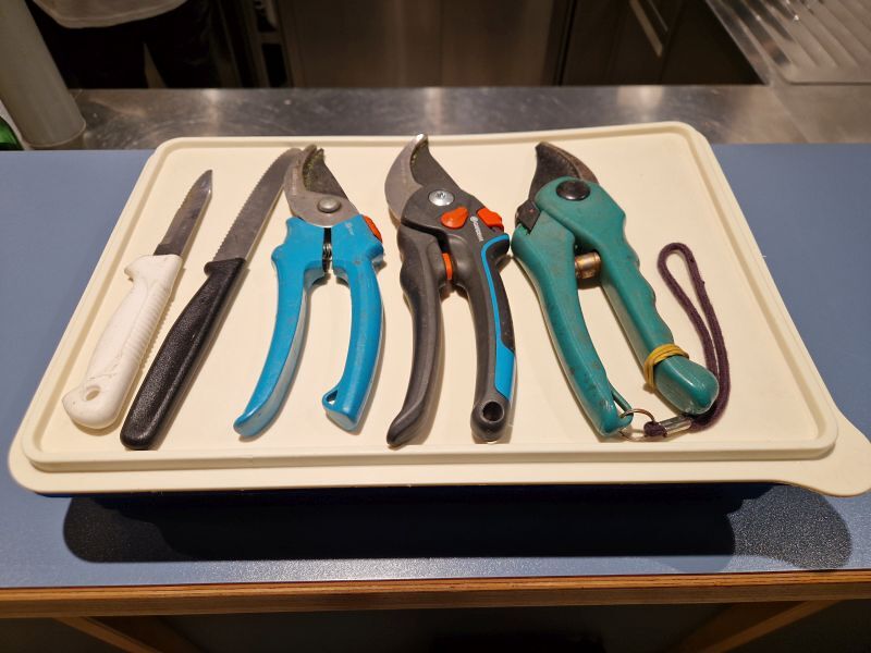 Nach dem Kranzen für den Adventbasar sind im Pfarrsaal einige Sache liegengeblieben (Messer, Gartenscheren, eine große Plastikbox mit Deckel).